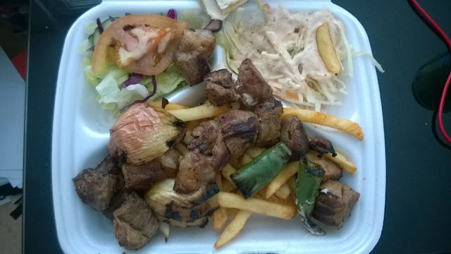 Denna gång beställde vi grillspettstallrik och en kebabrulle, vi tog med oss maten hem för att se hur take away servicen ser ut. Grillspettstallriken består av: grillad lammkött, ris/pommes, sallad, gurka, tomat, lök, peperoni, pizza sallad, bröd och valfri sås.